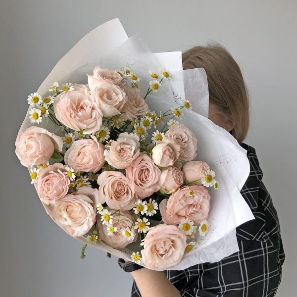 Нежный букет из пионовидных кустовых роз и воздушных веточек полевых ромашек упакован в стильную фирменную упаковку. Отличный подарок для любого повода.